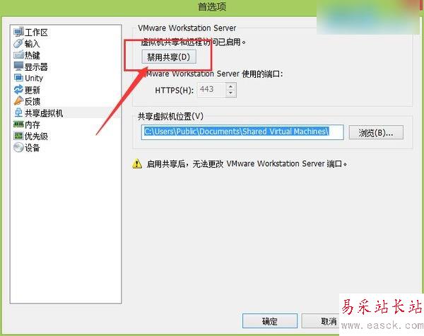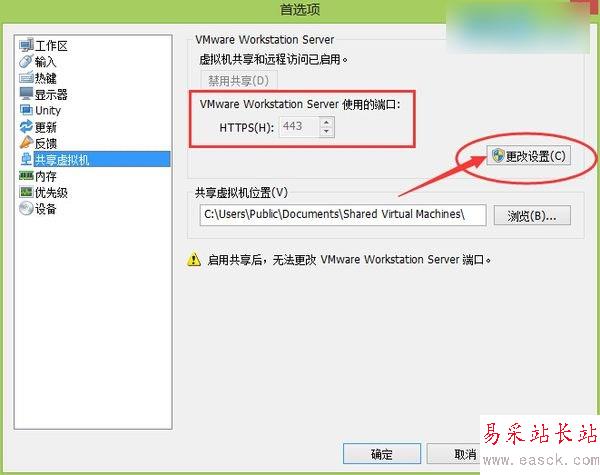 2、找到左側(cè)功能列表中的“共享虛擬機(jī)”,選擇后,在右側(cè)界面中點(diǎn)擊“更改設(shè)置”;