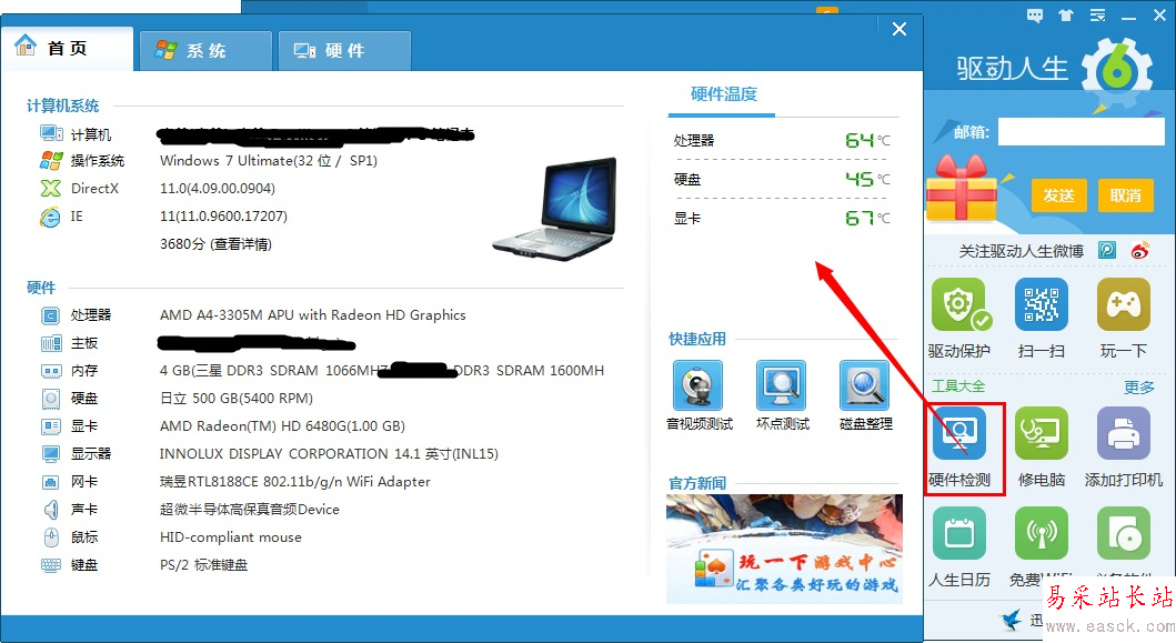 升級更新硬件驅(qū)動程序,可以使整機的性能提升不少。升級驅(qū)動時注意先弄清楚您電腦各個配件的具體品牌、型號。進入驅(qū)動人生硬件模塊,系統(tǒng)信息,電腦信息一目了然。還可以通過硬件檢測功能隨時關(guān)注了解您電腦的使用情況。