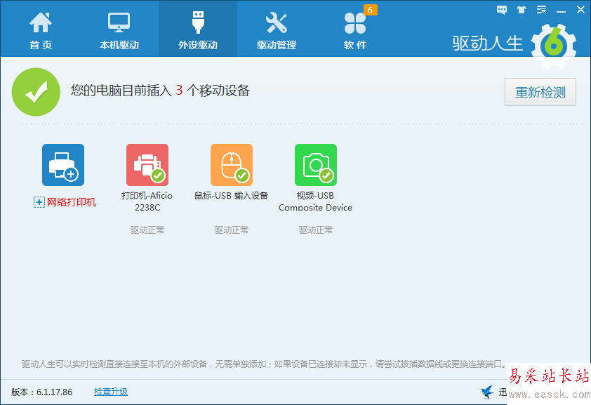 筆記本電腦需要安裝的驅(qū)動程序不僅僅是上面這些基本驅(qū)動,還有很多筆記本專用的特別驅(qū)動。電源管理、觸摸板、紅外線、藍牙、指紋識別等各種外設(shè)驅(qū)動,打開驅(qū)動人生的外設(shè)驅(qū)動,一鍵檢測下,看您的電腦還有哪些外設(shè)驅(qū)動需要下載安裝。