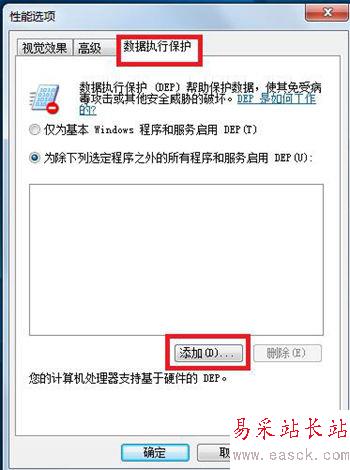 2. 在“性能選項”界面中選擇“數據執行保護”,然后選擇“為除下列選定程序之外的所有程序和服務啟用DEP(U)”,之后點擊“添加"按鈕;