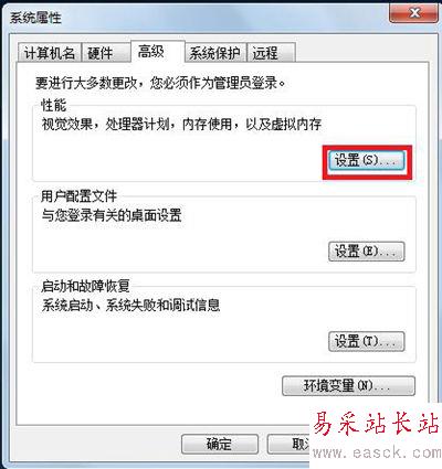 1. 首先在桌面選擇“我的電腦”然后右鍵選擇屬性。在跳出來的“系統屬性”中找到“高級”標簽。選擇紅色方框部分的“設置”按鈕;