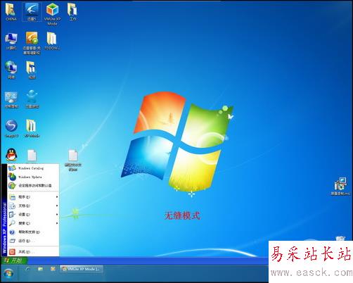 在無縫模式下,VMLite XP Mode將隱藏虛擬機基本窗口。將虛擬系統(XP)的任務欄與開始菜單放置于真實系統Windows 7的任務欄之上。