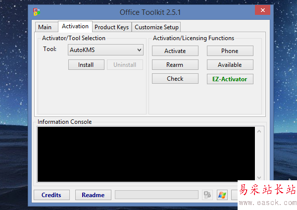 2、進入第二個選項卡“Activation”,并選擇Tool操作方法“AutoKMS”,安裝KMS服務,并在安裝成功后點擊“EZ-Activator”進行注冊操作。