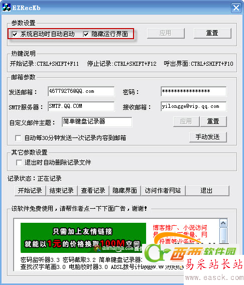 要想用好一款軟件,首先要根據(jù)自身情況對(duì)這款軟件進(jìn)行一些個(gè)性化的配置,如果您出門在外又想知道別人用你的電腦做了什么的話,可以選擇“系統(tǒng)啟動(dòng)時(shí)自動(dòng)啟動(dòng)”和“隱藏運(yùn)行界面”這兩個(gè)選項(xiàng),下次電腦重新啟動(dòng)之后簡單鍵盤記錄器就會(huì)在后臺(tái)忠實(shí)的記錄下電腦鍵盤所輸入的信息了。