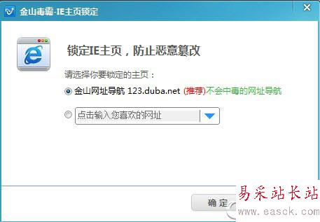 4、在彈出窗口中選擇毒霸網址大全或者輸入您想鎖定的主頁,點擊確定即可。