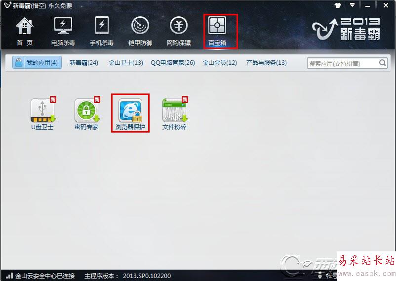 2、點擊“百寶箱”,選擇下方“瀏覽器保護", 如下圖:
