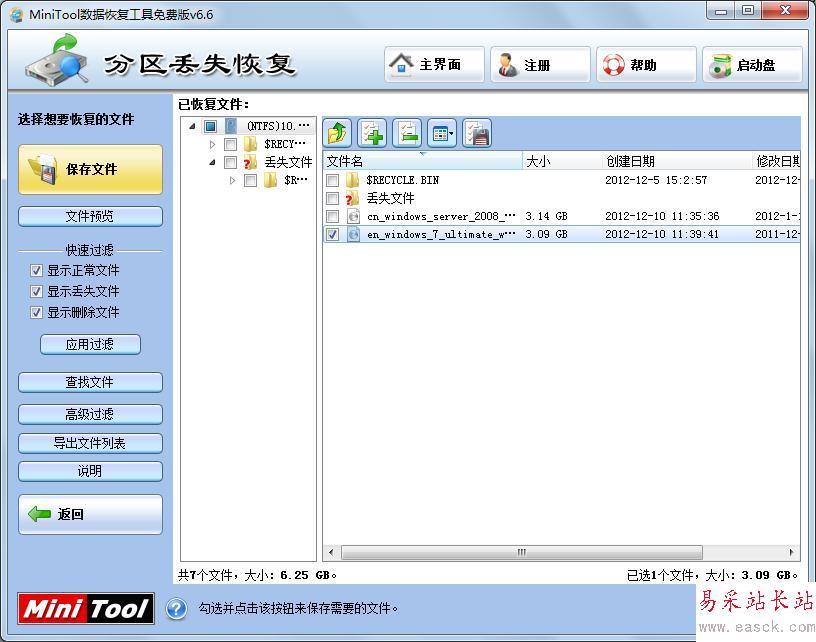然后,在顯示列表中找到并選中需要恢復的重要數據,并點擊“保存文件”按鈕對其進行恢復: