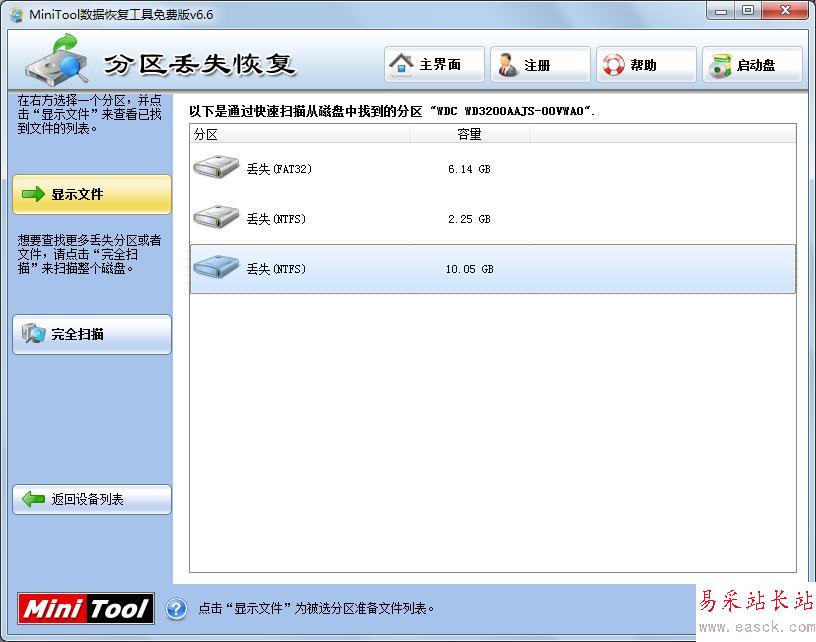 注意:如果在顯示列表中沒有找到目標分區,請點擊“完全掃描”按鈕對硬盤進行全面掃描,然后再找到并選中目標分區。