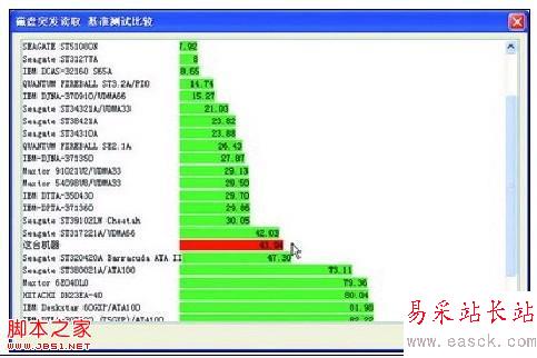 比如點(diǎn)擊磁盤"突發(fā)讀取率"右側(cè)的"比較"按鈕,就會(huì)得到如下圖所示的窗口.如果點(diǎn)擊工具欄上的"報(bào)告"按鈕,我們還能得到所選測(cè)試項(xiàng)目的詳細(xì)報(bào)告說明.