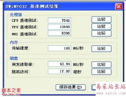 點(diǎn)擊工具欄上的"基準(zhǔn)檢測(cè)"按鈕就可以對(duì)CPU,硬盤,內(nèi)存的具體性能進(jìn)行檢測(cè),如下圖.點(diǎn)擊對(duì)應(yīng)項(xiàng)目欄的"比較"按鈕,還會(huì)顯示與同類硬件相比較得值,使我們對(duì)當(dāng)前所使用的硬件性能有一個(gè)直觀的認(rèn)識(shí).