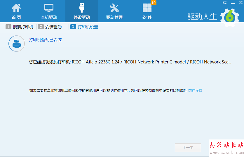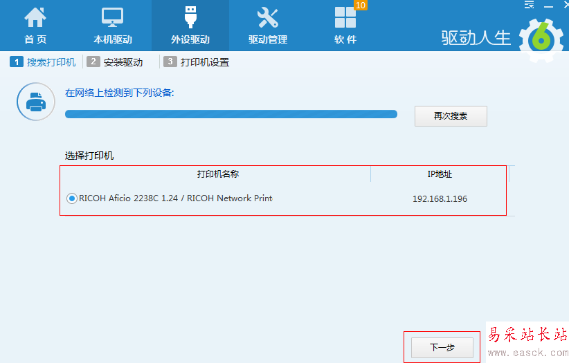 3、在打印機搜索頁面只需點擊搜索打印機,驅動人生6便自行搜索檢測局域網內的打印機型號,并顯示在主界面,如公司有幾臺打印機的,在此便可以自行選擇所需的打印機驅動點擊下一步進行安裝即可;