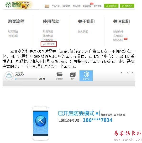 手機與云U盤綁定后,如果360隨身WiFi丟失,則可以到360隨身WiFi官網進行掛失及找回,用戶在掛失過程中需要輸入綁定的手機號,驗證成功后登錄并確認掛失,此時原來云U盤中的數據就會被抹掉,即使被其他人撿到也不用擔心自己的數據信息外泄了。