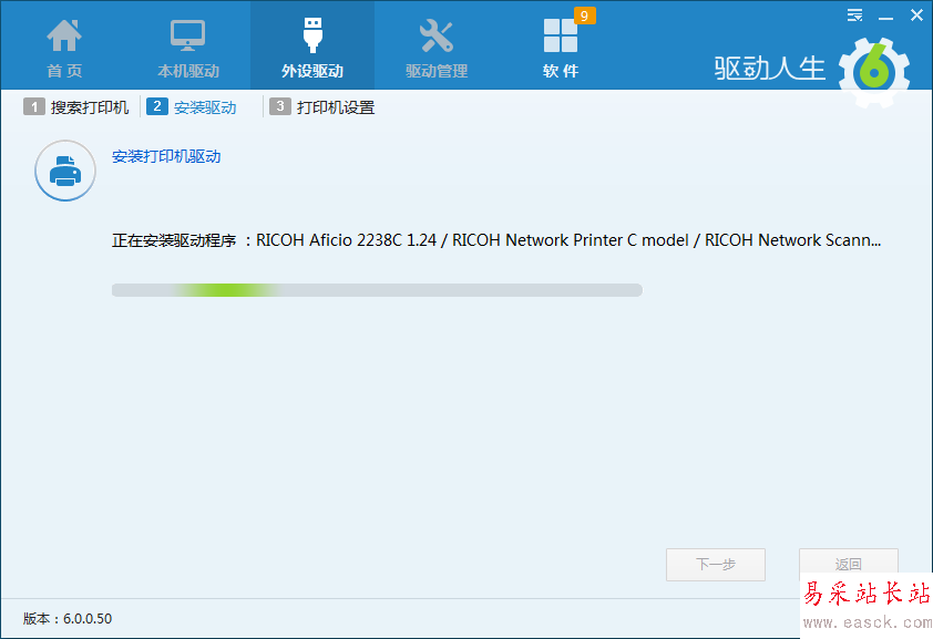 第二步,安裝驅(qū)動(dòng)。安裝打印機(jī)驅(qū)動(dòng)無需再去官網(wǎng)下載驅(qū)動(dòng),驅(qū)動(dòng)人生一站式搞定。搜索到打印機(jī)之后,驅(qū)動(dòng)人生會(huì)自動(dòng)搜索與該打印機(jī)匹配的打印機(jī)驅(qū)動(dòng),直接進(jìn)行安裝。打印機(jī)程序安裝完成之后,繼續(xù)點(diǎn)擊下一步。