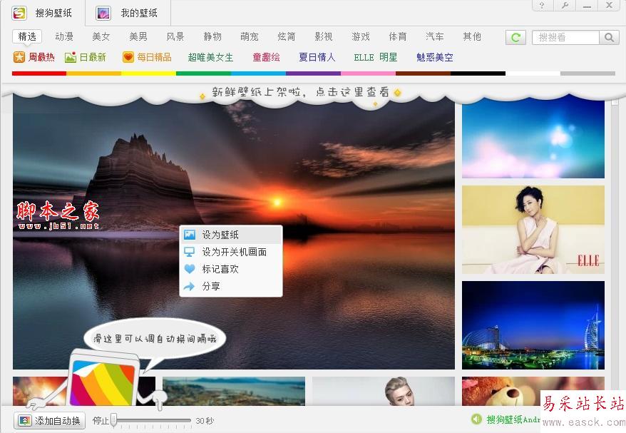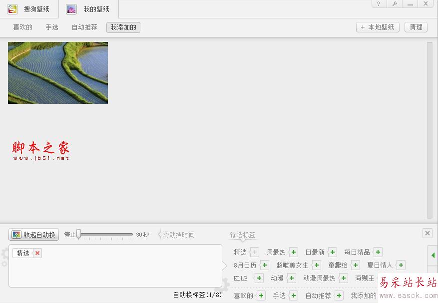 在搜狗壁紙左下角很明顯看到一個"添加自動換"按鈕,這個功能鍵可以幫你的桌面自動換壁紙哦,不過最大的間隔時間只有30秒