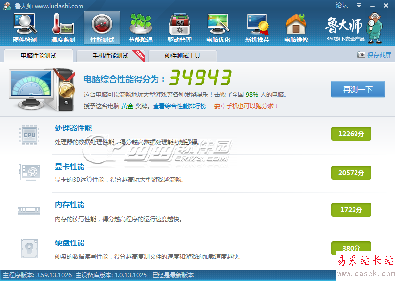 其實魯大師這款軟件的跑分只是作為一個大概的數據看看而已,真正的性能不能表現出太多,一定要做個比較的話可以在性能測試完畢后點擊分數下面的查看綜合性能排行榜看看自己的電腦性能在所有魯大師用戶中的排名情況。