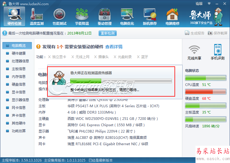 安裝完畢后打開軟件,魯大師會自動進行檢測,查看當前電腦的配置與驅動狀況。