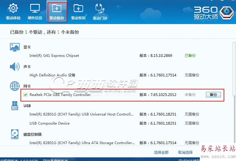 3、點擊主界面上面的驅動備份然后勾選想要備份的驅動程序點擊后面的備份鍵等待備份成功就ok 了。