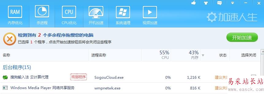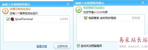 加速人生3.0.60.411版本 強化了此功能,程序殘留服務提醒優化功能:只要用戶退出一款軟件后,如有殘留的服務還在運行,將進行智能提醒,例如:快播沒有完全退出,還有1個程序在后臺運行。用戶可以點擊立即關閉,即可完全退出該軟件的所有服務,真真正正的為電腦節省內存空間。
