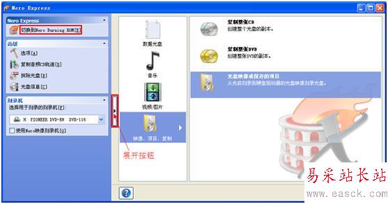 有的朋友或許用另外一種界面 Nero Burning ROM比較多,我們可以通點(diǎn)擊 展開(kāi)按鈕-->切換到Nero Burning ROM [E] 來(lái)進(jìn)行切換。如 [圖2]