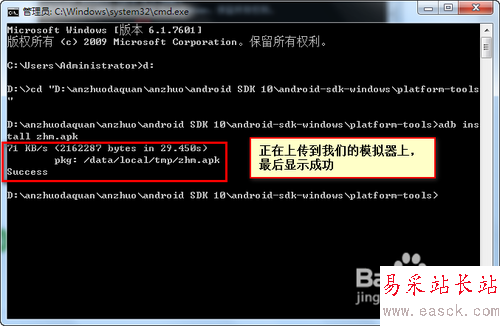 回車 ,如果出現(xiàn)下面的提示,說(shuō)明正在長(zhǎng)傳到我們的模擬器上,大家等待一會(huì),最后會(huì)有Success的提示