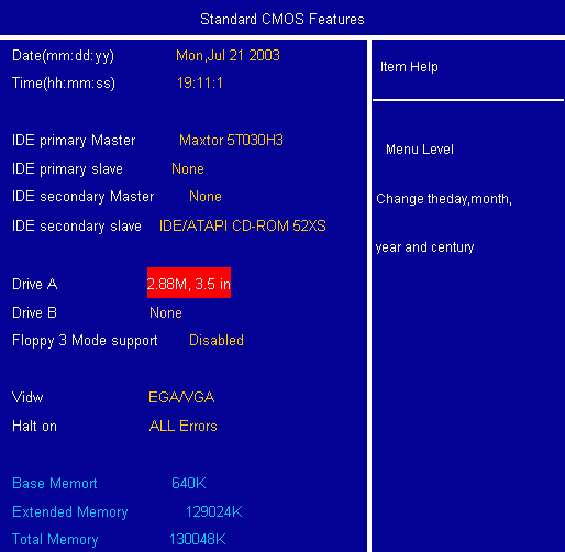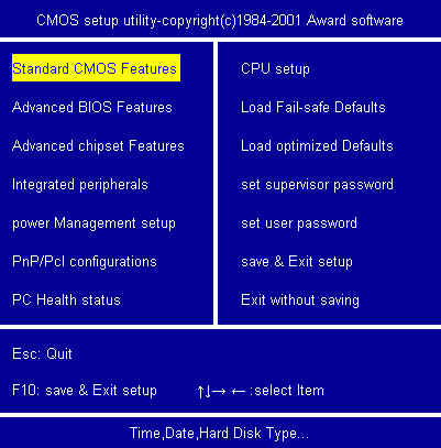 1、開機按“Del”鍵進入CMOS,進入第一項“Standard CMOS Features”,回車.