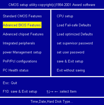 3、按“ESC”鍵返回CMOS主菜單,按"↓"到第二項"Advanced BIOS Features",回車.