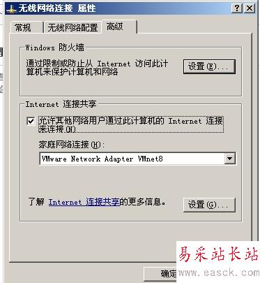 現在開始設置網絡,我使用的是無線網絡(如果是本地連接,設置方式相同),右鍵選擇無線網絡連接,在屬性窗口中選擇高級,選中允許其他網絡用戶通過此計算機的Internet連接來連接,并在家庭網絡連接處,選擇 VMware Network Adapter VMnet8,如圖,確定
