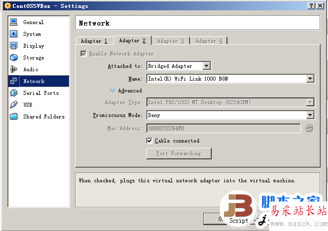 在Vitual Box軟件中選擇該虛擬機(jī),打開網(wǎng)絡(luò)設(shè)置。第一塊網(wǎng)卡是Host-Only方式。點(diǎn)擊Adapter2,配置如圖所示: