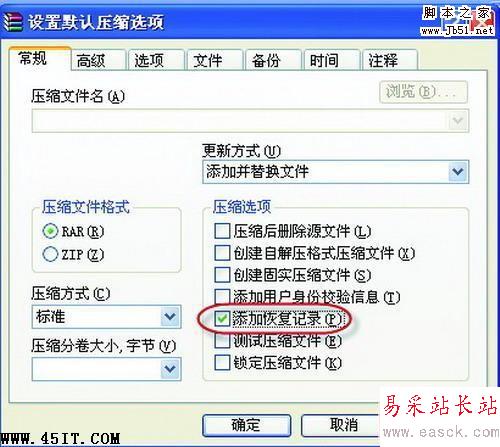 Step 02然后會彈出一個名叫“設置默認壓縮選項”的窗口,進入“常規”選項卡,在該選項卡的右下部分中有不少的壓縮選項,勾選其中的“添加恢復記錄”,然后再進入“高級”選項卡,在恢復記錄中設置百分比為3%,然后點擊“確定”就OK了。