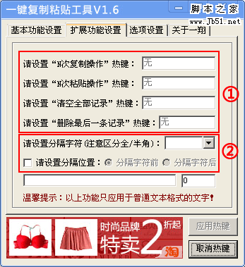 1、①中設置的四個熱鍵分別代表四組快捷鍵,具體如下: