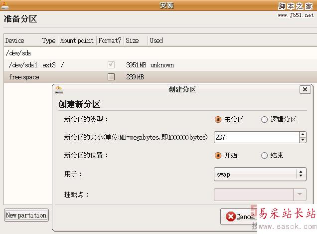 對一般玩玩,linux的分區最少占用兩個,一個掛載根文件系統的分區和一個交換分區,其中文件系統分區要格式化,容量大于2G,交換分區(swap)一般取內存的1.5倍以上。