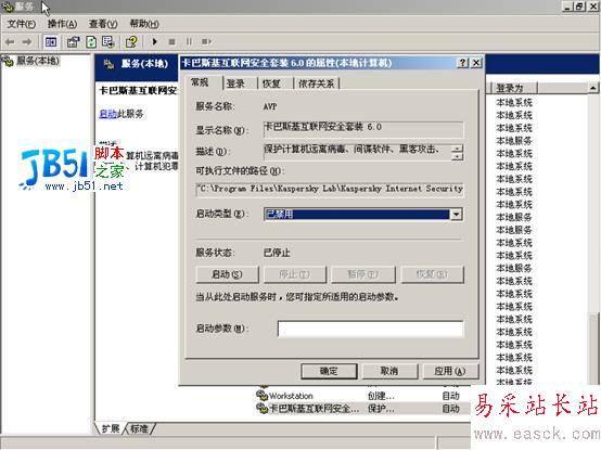 2、進入系統后,在提示框中輸入services.msc,啟動“服務管理程序”。在右邊的窗口中找到卡巴斯基的服務,雙擊,在啟動類型中選擇“已禁用”。