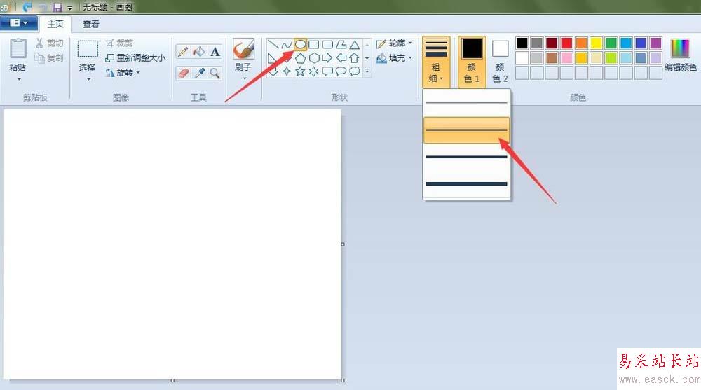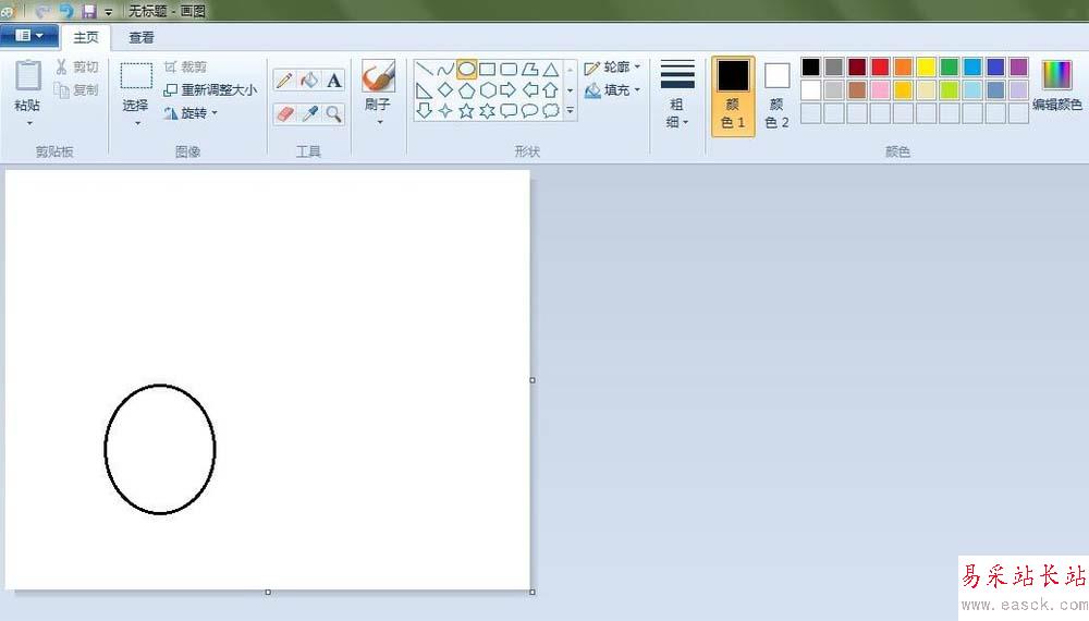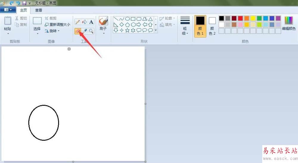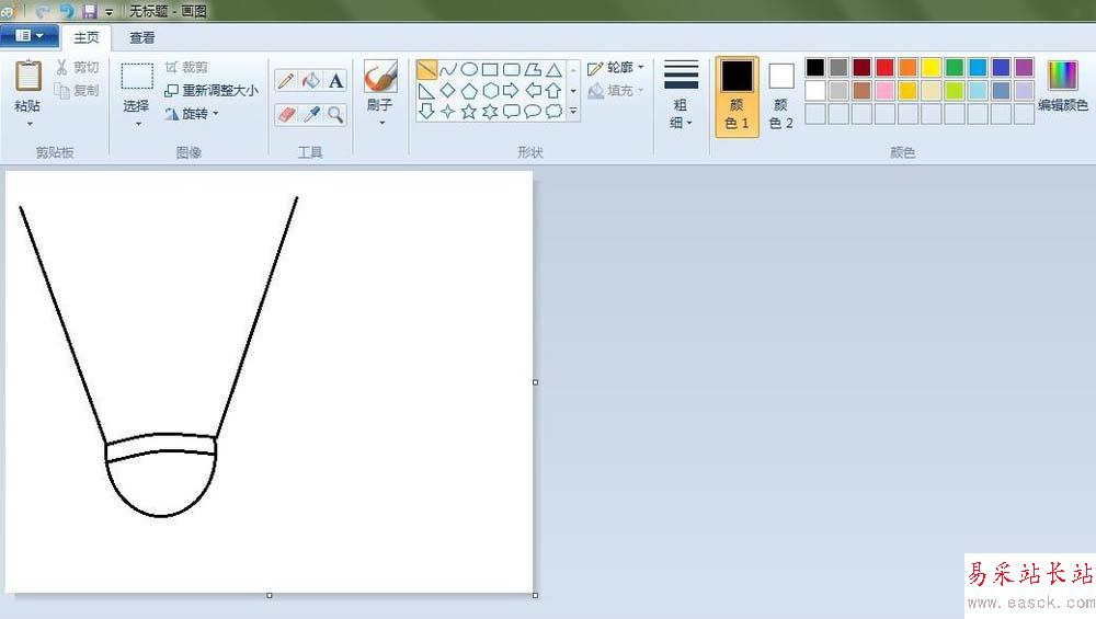 2、羽毛球的頭部:點(diǎn)擊“橢圓形”按鈕,線條粗細(xì)(第二個(gè)),先在“畫紙”適當(dāng)位置上畫上一個(gè)橢圓;點(diǎn)擊“橡皮擦”按鈕,將畫好的橢圓擦掉一些;點(diǎn)擊“曲線”按鈕,在如圖的地方畫兩條曲線。