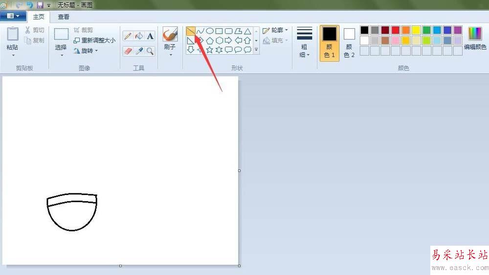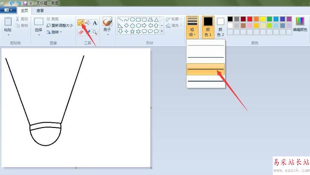 3、羽毛球的羽毛輪廓:點(diǎn)擊“直線”按鈕,在如圖的地方畫兩條直線;點(diǎn)擊“鉛筆”按鈕,線條粗細(xì)(第三個(gè)),在如圖的地方畫出弧度線。