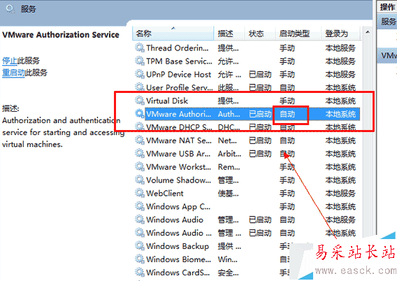 6、在服務列表中找到VMWare Authorization Service,并將其設置為自動啟動并且開啟服務即可。