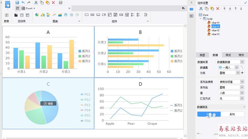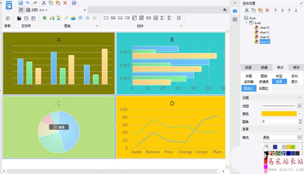 6、返回到報表設計器,分別設置四圖的背景顏色和邊框顏色,調整柱狀圖和條狀圖的柱子的寬度,如下圖所示: