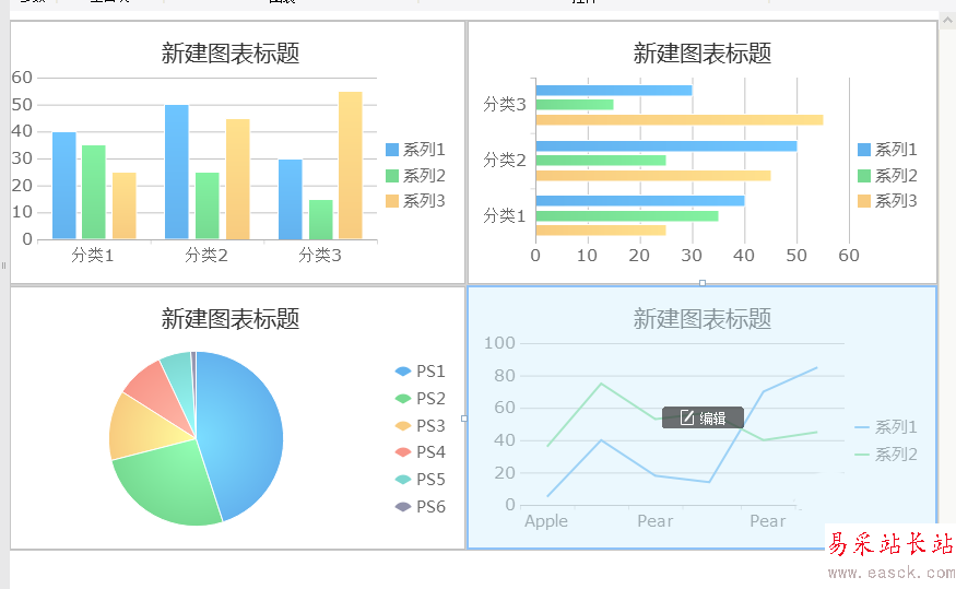 2、依次拖動到柱狀圖、條狀圖、餅圖和折線圖到編輯區域,調整四圖位置和坐標,如下圖所示: