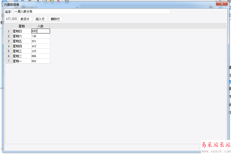 3、新建一個內置數據集,創建一個表,包含了星期和人數兩個字段,并插入七條記錄,如下圖所示: