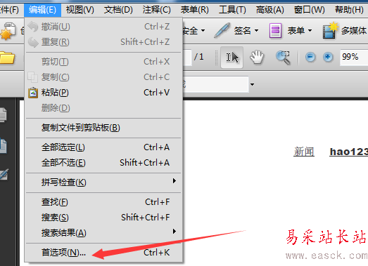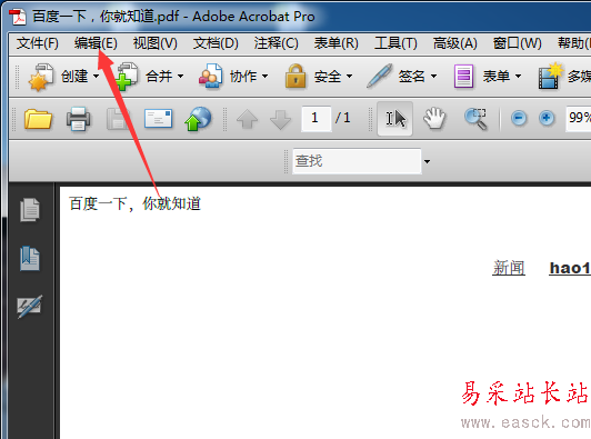 2、然后進行點擊了的Adobe Acrobat的菜單中的編輯的菜單。