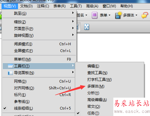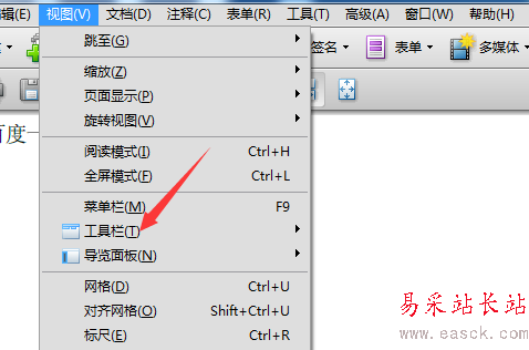 1、首先,打開一個Adobe Acrobat的,點擊菜單中視圖的菜單,彈出了下拉菜單選中為工具欄的選項。