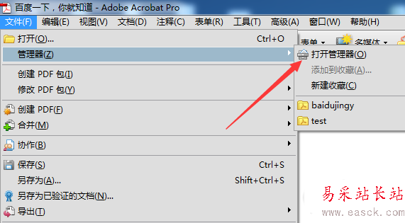 2、點擊了文件的菜單之后,彈出了下拉菜單選中為 管理器 的選項。