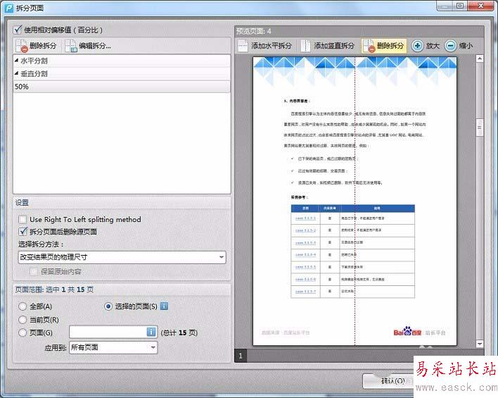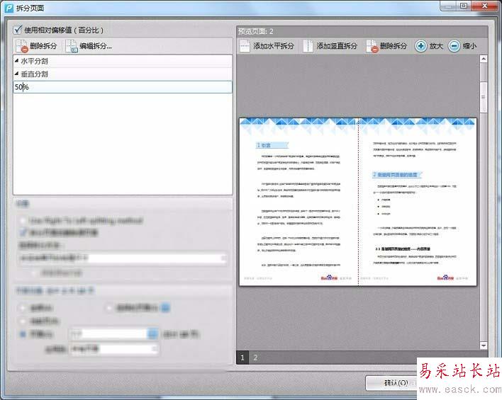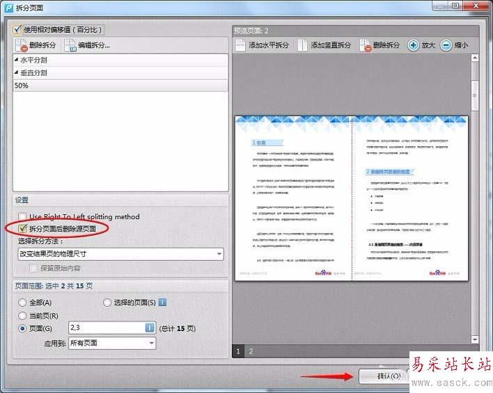 5、最后在設置選項中可以選擇保留拆分的源頁面或者是刪除源頁面。設置完成后點確認,頁面就拆分成功了。