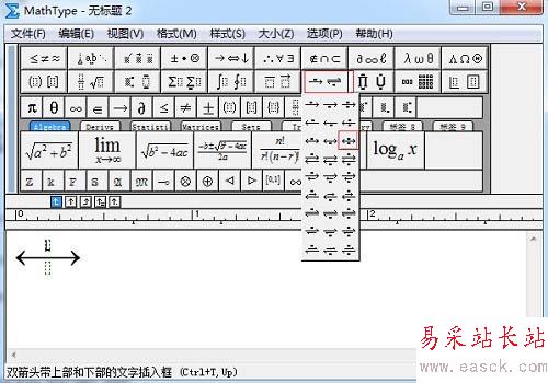 2、從“格式”菜單中,選擇“定義間距”將分子深度設置為150。點擊“確定”后回到MahtType編輯窗口。在工具欄選擇“雙箭頭帶上部和下部文字插入框”模板并插入。