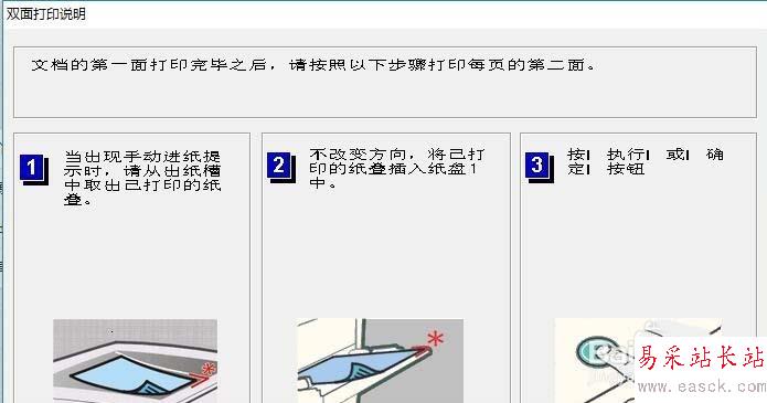 5、對于不具有雙面打印的設備,待完成單面的打印操作后,將彈出如圖所示的提示。在此直接根據提示將單面打印紙放入即可實現雙面打印。