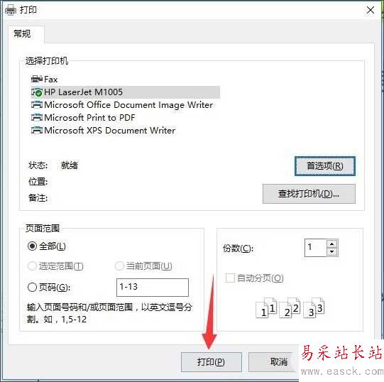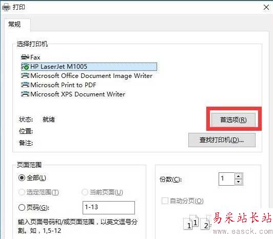 2、此時將彈出“打印”窗口, 如圖所示,點擊“首選項”按鈕進入。