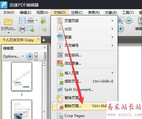 6、當然,有時我們可能需要對pdf文檔本身的頁面進行調整或刪除操作。針對此類情況,我們可以借助相關pdf編輯器來實現。如圖所示,點擊“文檔”-“刪除頁面”項即可實現。