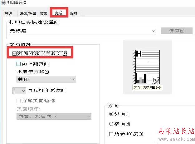 3、待打開“打印首選項”窗口后,切換到“完成”選項卡,在“文檔選項”欄目中勾選“雙面打印”項,點擊“確定”按鈕。