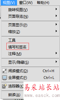 2、然后點擊界面最上方的“視圖”主菜單,出現(xiàn)如下多個選項,選擇其中的“填寫和簽名”選項