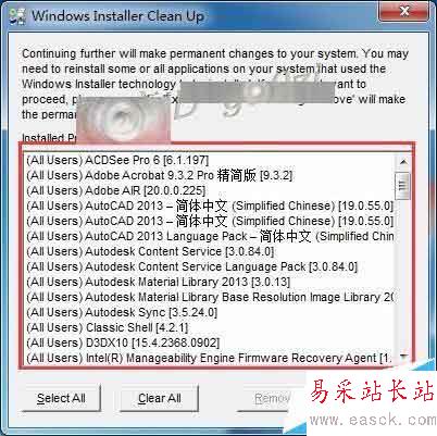 8、結查看發(fā)現(xiàn)是因為之前清理垃圾文件把原Office2010的安裝文件和補丁都刪除了,導致無法卸載,因此需要下載Windows Install Clean Up,微軟官方提供的安裝程序清理工具,下載完成后,安裝,再打開,可以看到已經(jīng)安裝的軟件產(chǎn)品列表