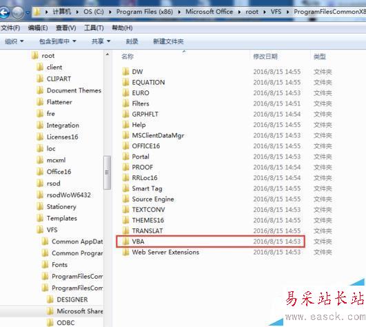 3、然后,依次打開C:/Program Files (x86)/Microsoft Office/root/VFS/ProgramFilesCommonX86/Microsoft Shared/VBA,這個因人而異,只要找到VBA文件夾就行。